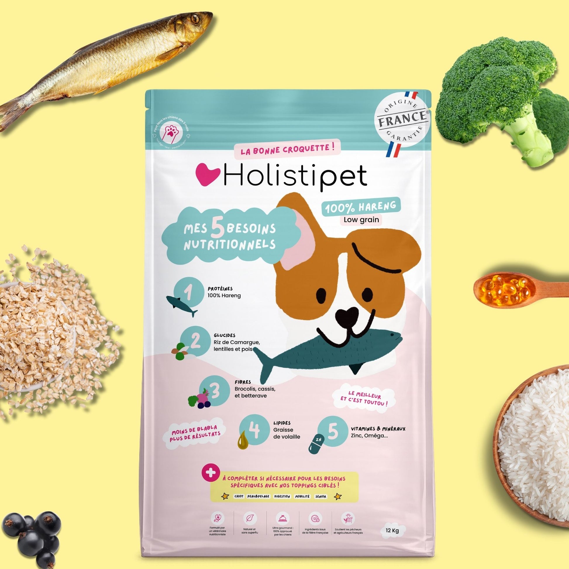 Hareng déshydraté, Riz, graisse de volaille, flocons d’avoine, pulpe de betterave, lentilles, pois, levures de bière, fibres végétales, graines de lin, pulpe de chicorée, hydrolysat de foie de volaille, brocolis, cassis.